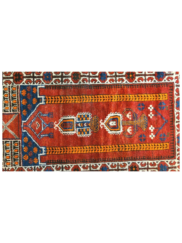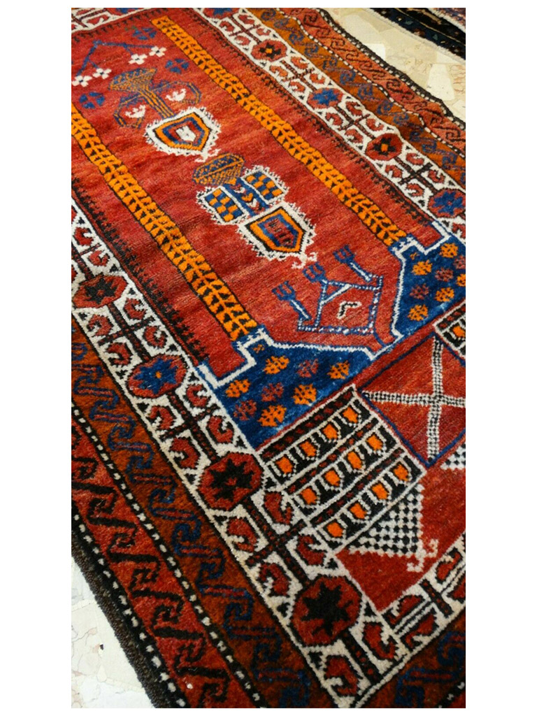 Sul confine tra Iran e Afghanistan vivono i Baluci; con questo nome si indica genericamente un gruppo di nomadi composto da tribù minori di varia origine. Questi ultimi vivono di agricoltura, allevamento di ovini, capre e cammelli e annodatura di tappeti.I tappeti Baluci hanno una stretta familiarità con i tappeti provenienti dall’Afghanistan e dal Turkmenistan. I colori che li caratterizzano sono opachi, rosso scuro, blu scuro, nero e marrone. I motivi sono geometrici, con alberi della vita stilizzati. Spesso sono designati come tappeti da preghiera, con la nicchia. extra fine e molto morbido 100% lana MIS: 128×85 CM eta:1920 origine: persia In condizioni buone . Con certificato e garanzia