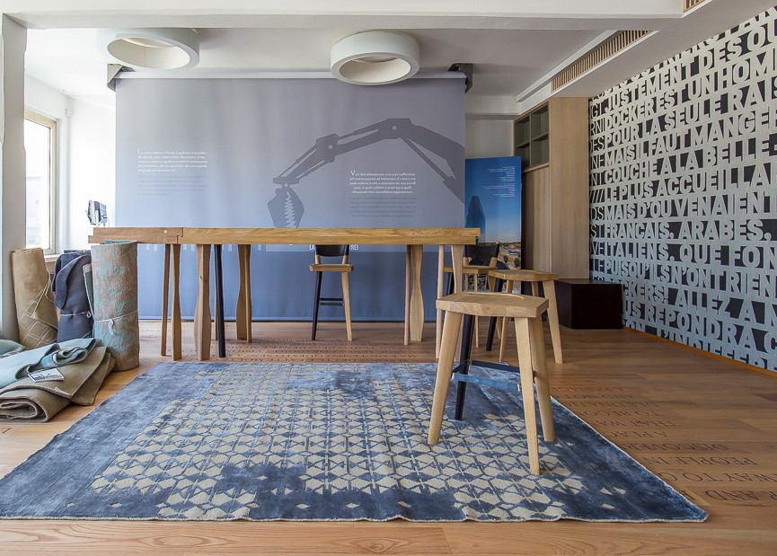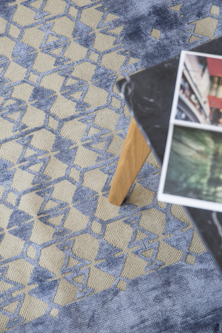APPETO Unione – Contemporaneo con Motivo Geometrico Unione è un tappeto dallo spirito moderno e ricercato, dove l’equilibrio tra ordine e imperfezione diventa arte. La superficie è decorata con un pattern geometrico ripetuto, che si dissolve gradualmente nel fondo sfumato grigio-blu, creando un effetto visivo di fusione tra struttura e materia. Il disegno è tagliato a mano con forbici, in rilievo, per un effetto tattile elegante e raffinato. Annodato a mano, Unione esprime tutta la qualità dell’artigianato tessile unita a un’estetica contemporanea, perfetta per interni minimal, moderni e di design.