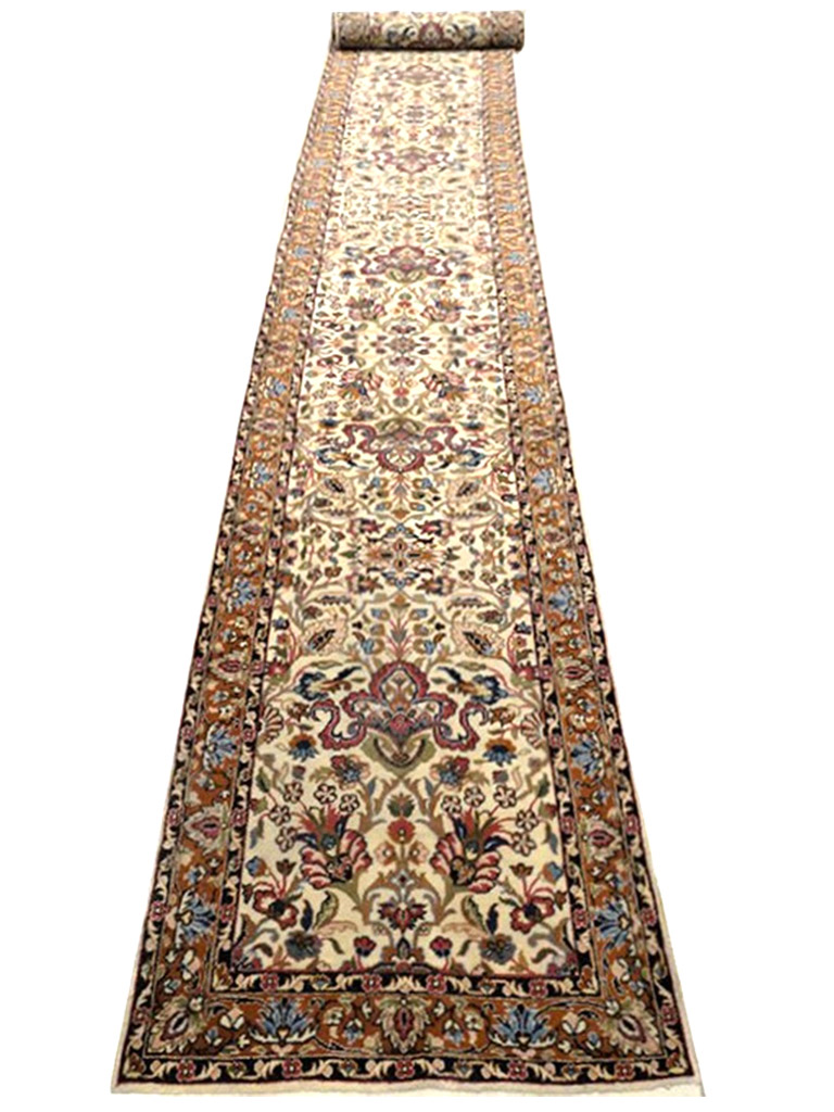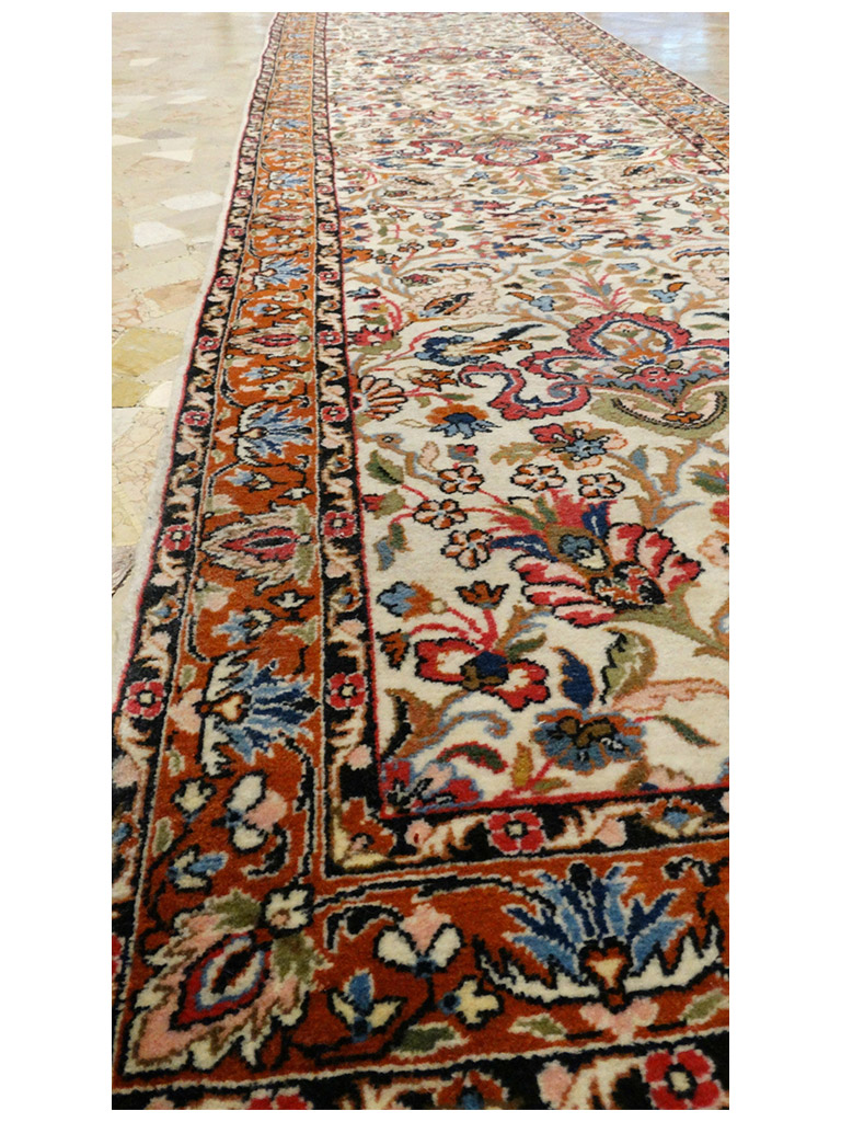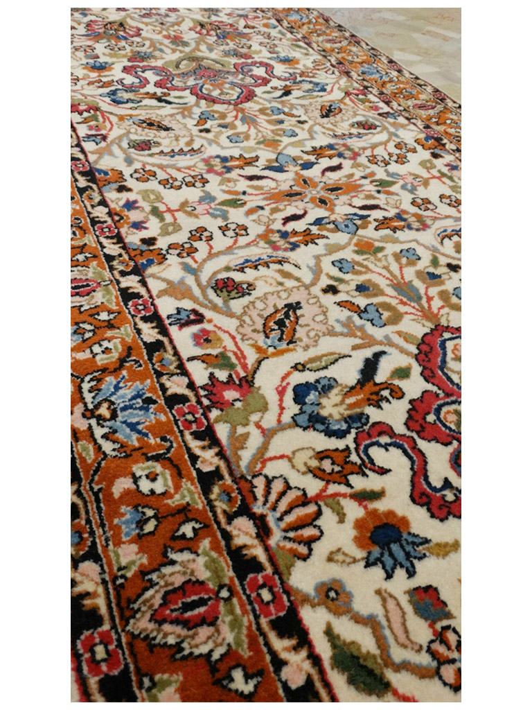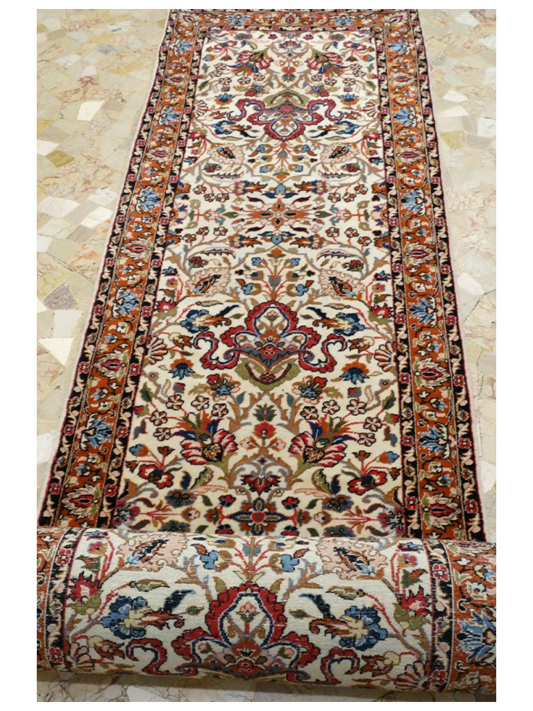 La città di Saruk si trova nella regione centrale dell’Iran a circa 40 km a nord di Sultanabad. La produzione di  tappeti in questa area, si intensificò notevolmente verso la fine dell’800. I Saruk possono presentare diversi schemi decorativi, ma comunque sempre di tipo floreale. I colori più utilizzati sia per gli esemplari antichi che per quelli contemporanei sono il rosa, il blu e il beige. Il loro nodo è di tipo asimmetrico e può raggiungere livelli densità piuttosto elevati. Molto importanti e ricercati sono i cosiddetti Saruk “Americani”: si tratta di esemplari prodotti per il mercato statunitense tra la fine dell’Ottocento e i primi del Novecento, prevalentemente di grande formato, decorati con grandi ramages fioriti che erano raccolti a formare un medaglione nel centro e distribuiti simmetricamente su tutto il campo. Le lane usate erano di alta qualità, spesso importate dal Regno Unito, mentre il colore più usato era una raffinata tonalità di rosa detto dughi. I Saruk “Americani” sono oggi tra i tappeti persiani antichi più ricercati e apprezzati. mis:500×80 cm Materiale:lana e cottone Origine:yerevan Età:1980 con certificato di garanzia in buone condizioni