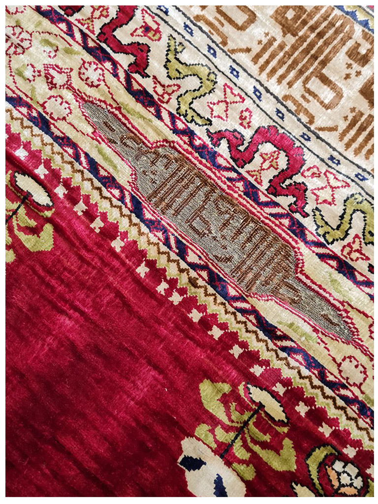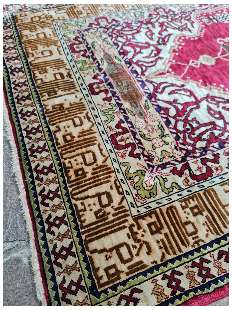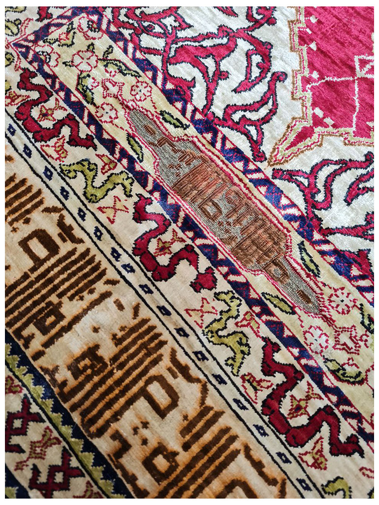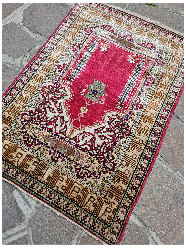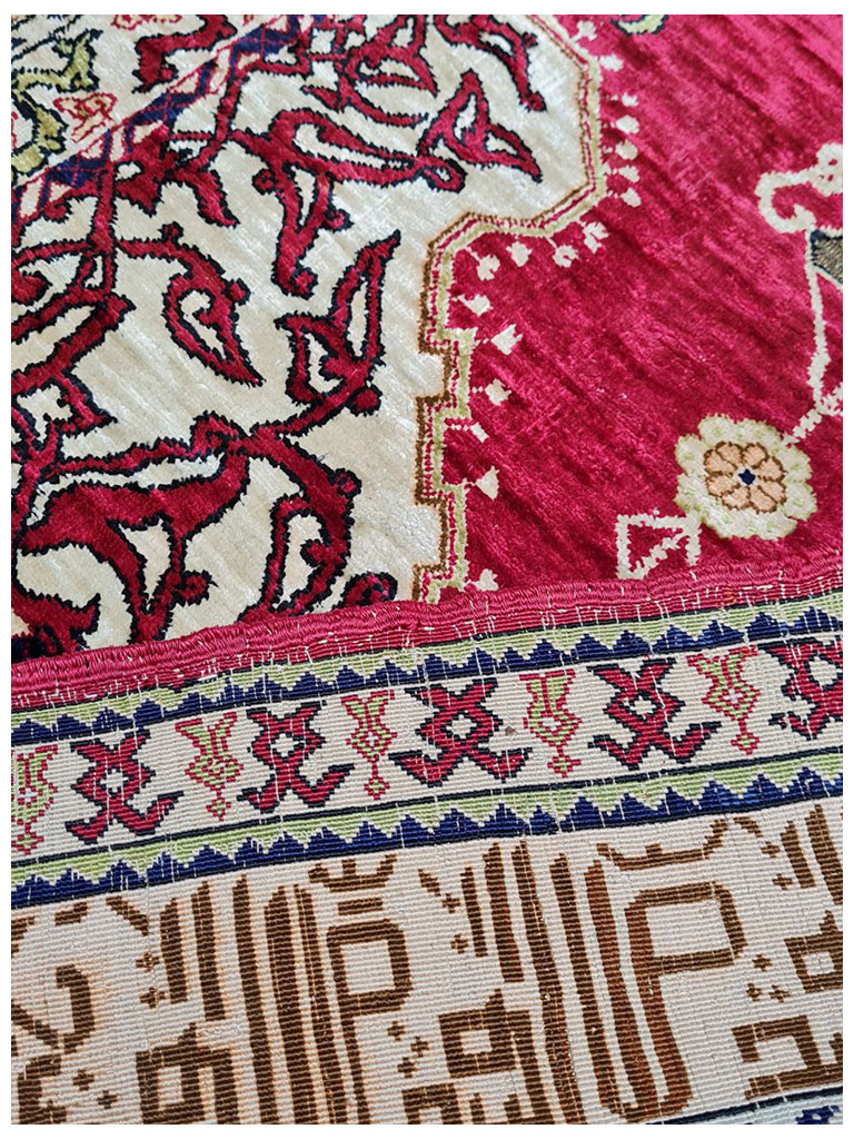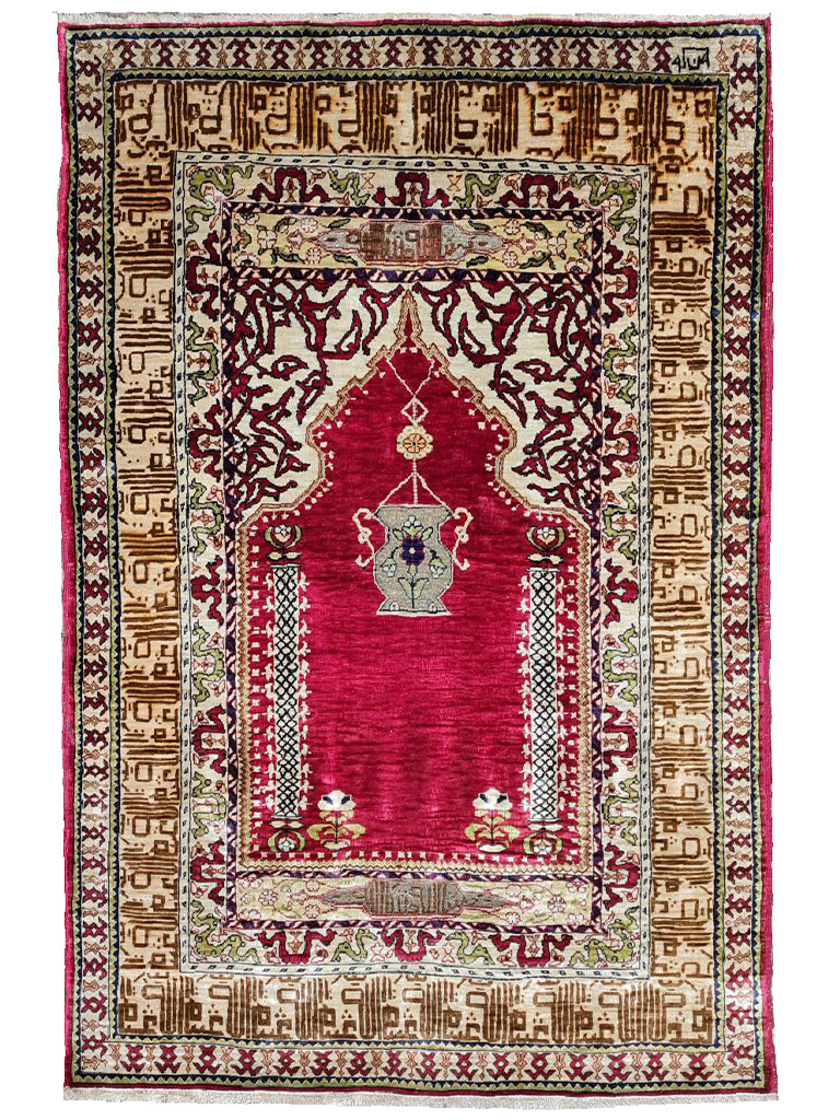 Hereke è una città della provincia di Kocaeli, in Turchia, situata al limitare nord del Golfo di Izmit, a circa 60 km. da Istanbul. Hereke è famosa per la produzione dei tappeti più fini al mondo e che rappresenta il culmine di tutta la tradizione turca di annodatura. Le origini della produzione dei tappeti in questa zona risalgono al XVI-XVII secolo: i manufatti dell’epoca risentivano dell’influenza dei decori persiani ed europei dai quali mutuarono molti elementi che qui furono, però, sapientemente miscelati con motivi turchi più tradizionali, dando vita a decorazioni di raffinato equilibrio e di rara originalità.Fu però a metà del XIX secolo che la produzione conobbe un grande sviluppo, grazie alla presenza delle industrie specializzate nella lavorazione della seta e alla precisa volontà del Sultano ottomano Abdulmecid I che qui stabilì la Manifattura Imperiale di Hereke (1841/43) con l’intento di produrre tessuti, tende e tappeti esclusivamente per la corte ottomana.La fondazione della manifattura coincise peraltro con la costruzione di Palazzo Dolmabahçe a Istanbul. Il sultano sosteneva che i più grandiosi palazzi del mondo dovessero sfoggiare anche i più raffinati tappeti del mondo.Per questa ragione riunì ad Hereke i migliori artisti e annodatori di tappeti dell’impero e in breve la manifattura cominciò a produrre tappeti di altissima qualità, con decori raffinatissimi e dimensioni straordinarie. Un laboratorio specializzato fu fondato anche nei sotterranei del palazzo imperiale dove lavoravano maestranze ed annodatori provenienti da Hereke. con scrittura coranica eta: 1930 materiale : 100% seta naturale di alta qualità MIS:88×62 CM origine : turchia in perfetto condizione con certificato di garanzia