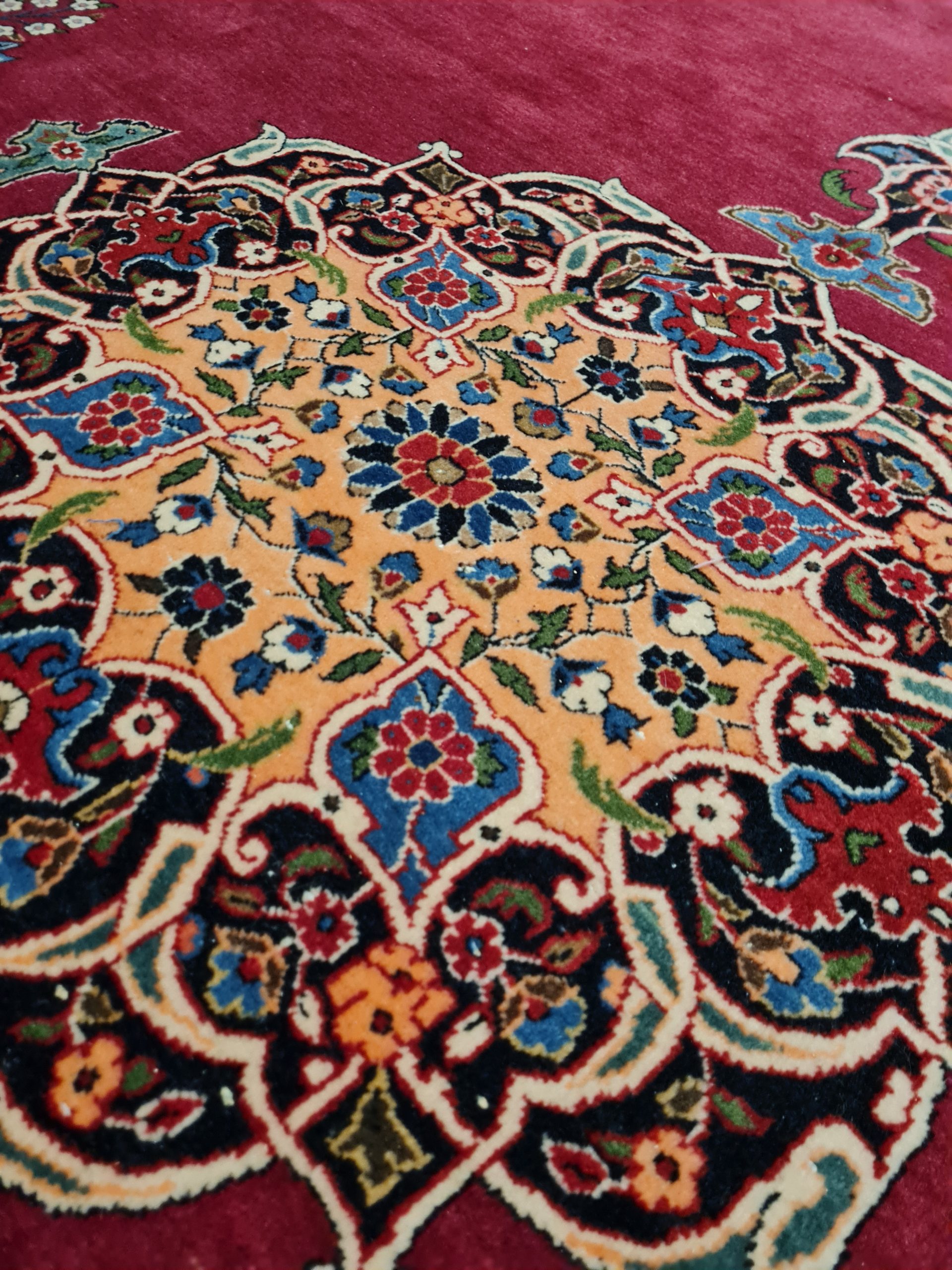 Kashan è un’antica città situata sulla strada che porta da Teheran ad Isfahan in una zona arida in prossimità del deserto Dasht-e-Kavir a circa m 1000 sul livello del mare. È una città ricca di storia e di monumenti, con una grande tradizione nella tessitura dei tappeti. Già all’epoca Safavide Kashan era rinomata per la maestria e la raffinatezza dei suoi tessitori, tanto che sorgeva in questa città un laboratorio reale per la tessitura dei tappeti, cui sono attribuibili molti polonaises. Seguì un periodo di decadenza che durò fino alla metà del XIX sec. quando la tessitura dei tappeti ritornò all’antico splendore. La produzione di questo periodo ci ha lasciato numerose testimonianze tanto che i Kashan della fine dell’800 sono tra i tappeti persiani antichi più rinomati