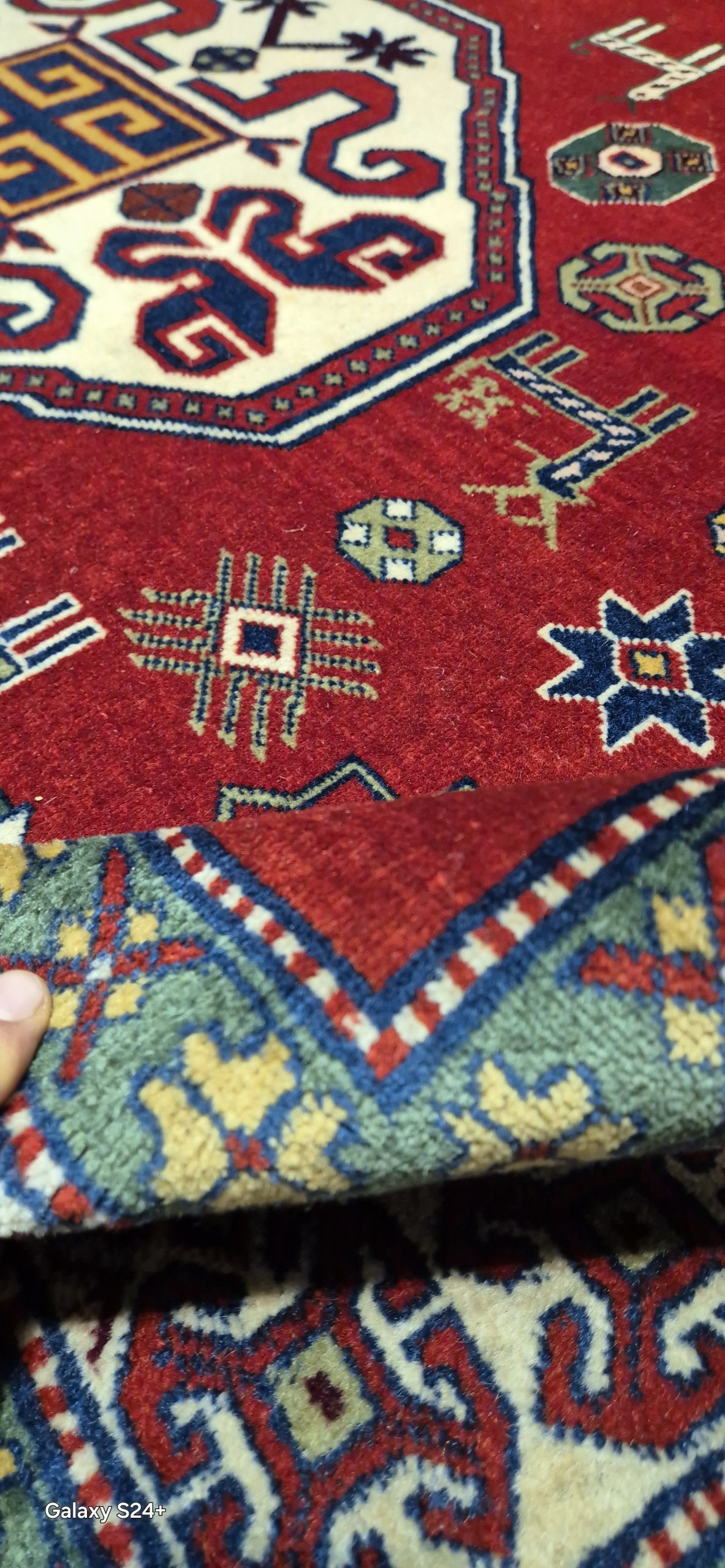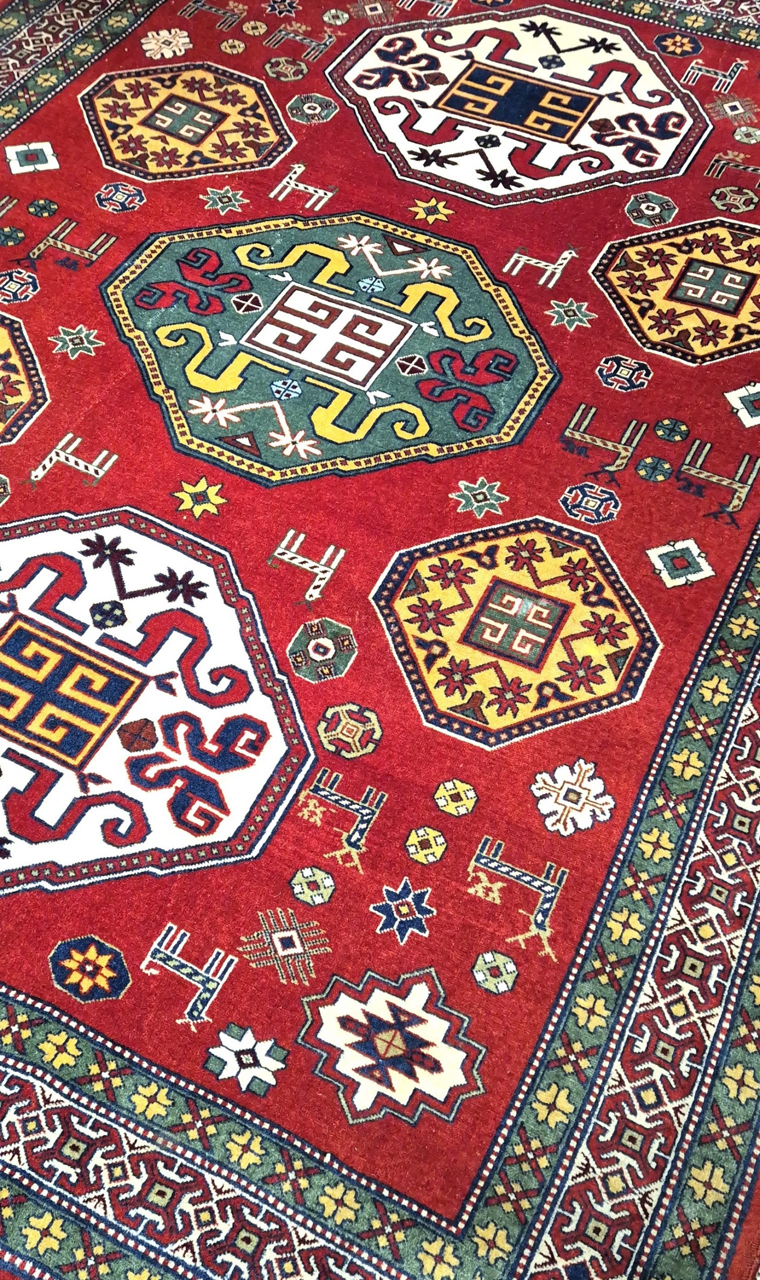 Realizzato in lana su trama in cotone e annodato interamente a mano, presenta la tipica tessitura robusta e resistente delle manifatture caucasiche. Le tinture naturali donano profondità cromatica e un caldo colore rosso antico brillante, capace di valorizzare ambienti sia classici sia contemporanei.