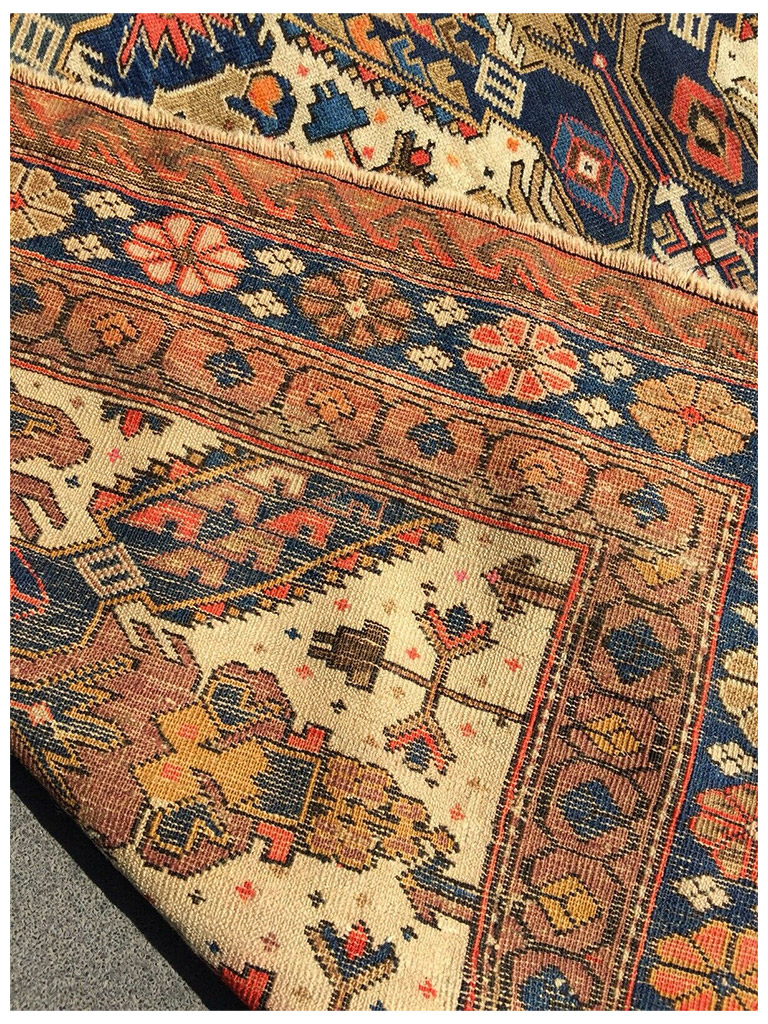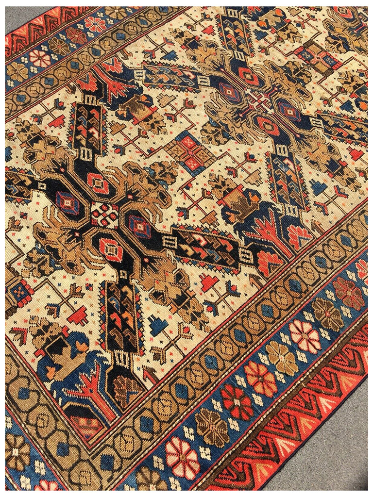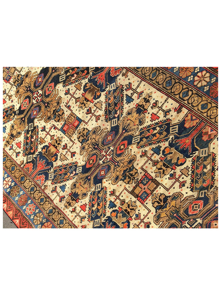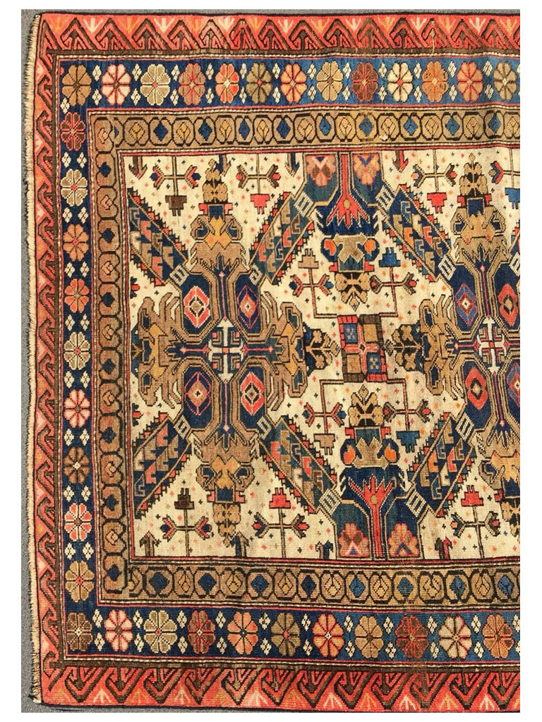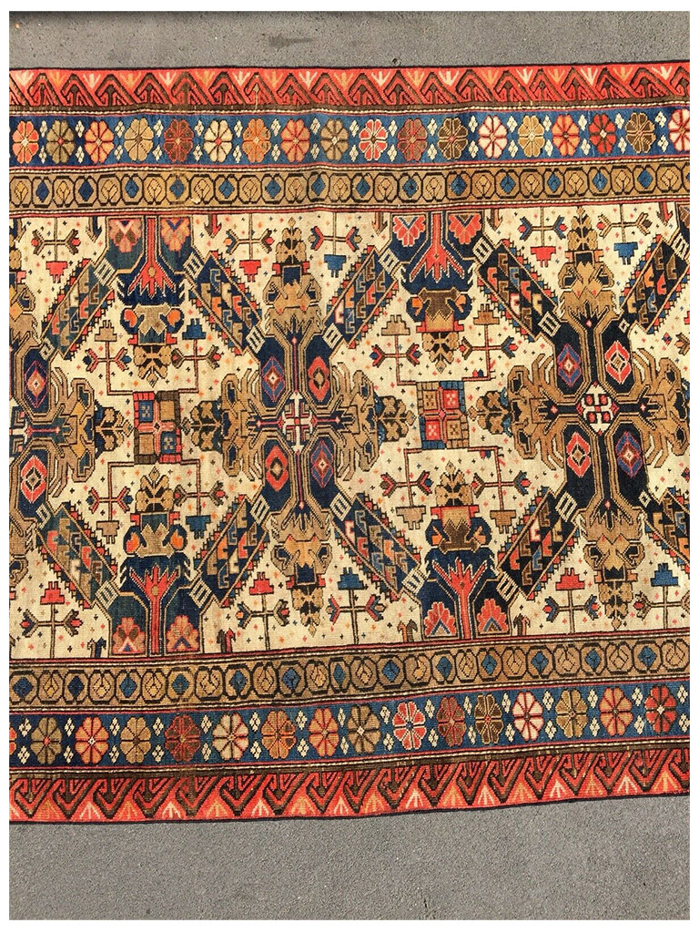 Provenienza: villaggio di Shirvan situato in prossimità della riva sud-occidentale del Caspio e del distretto omonimo compreso nella zona meridionale dell’Azerbaigian. Lavorazione: la trama e l’ordito sono in lana negli esemplari antichi, in lana o in cotone in quelli annodati tra il 1850 e il 1930 e totalmente in cotone nella produzione moderna. Il vello è sempre in lana dal taglio raso. La produzione moderna ha generalmente un numero di nodi superiore rispetto agli esemplari vecchi ed antichi-Zeikhur e il posto vicino al Mar Caspio, e i tappeti che ne prendono il nome sono annodati da una popolazione che, secondo la leggenda discende, dai mongoli. Una delle decorazioni più importanti è quella a croce di S.Andrea extra fine e molto morbido 100% lana MIS:188×129 CM origine:azerbaijan eta: 1890-1900 circa in buone condizione con certificato di garanzia