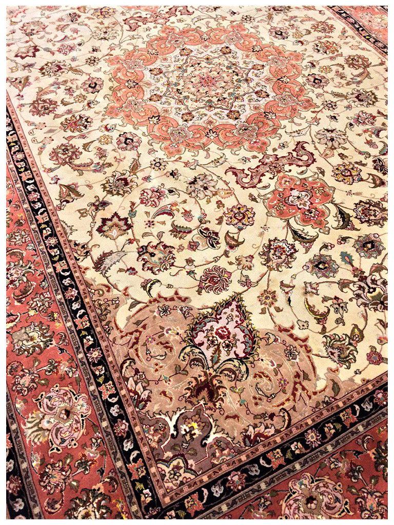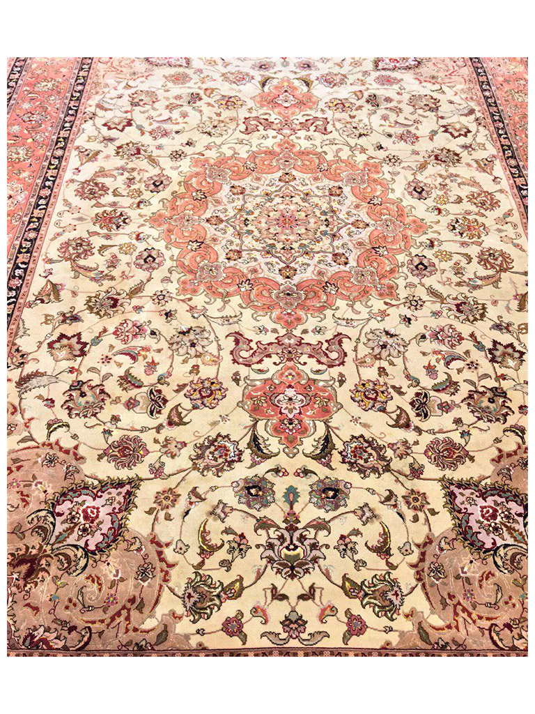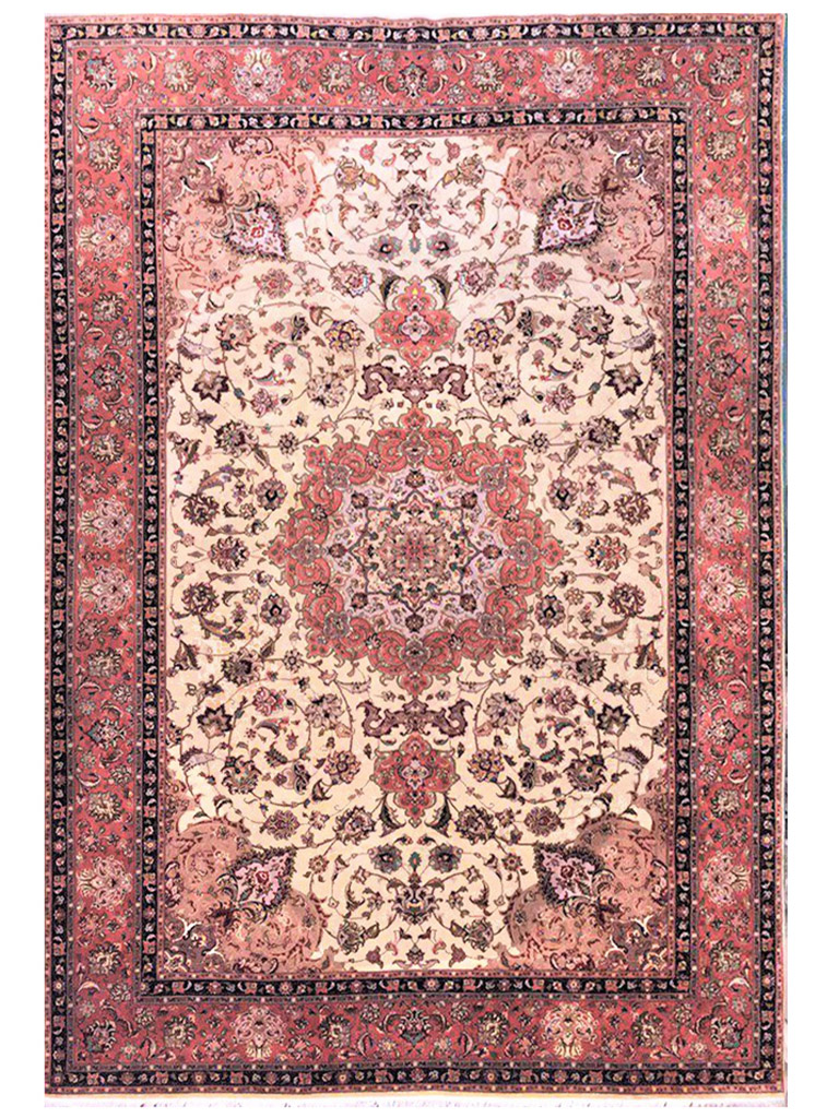 Tabriz è uno dei principali centri di produzione di tappeti in Iran. Geograficamente si colloca nella regione nord occidentale del paese ai piedi dei Monti Sahand a 1348 metri di altitudine, in prossimità del confine con la Turchia e a 150 km dal confine con l’Azerbaijan. La tessitura dei tappeti in questa città ha tradizioni antichissime, inoltre grazie alle molte influenze subite grazie alla sua posizione geografica i tappeti di Tabriz presentano una grande varietà di decorazione. Anche dal punto di vista qualitativo i Tabriz spaziano dai tappeti più grezzi e dall’annodatura grossolana a capolavori che esprimono le vette più alte raggiunte da questa straordinaria forma di artigianato. La finezza dell’annodatura dei Tabriz si misura in radj: un radj è un’unità di lunghezza pari a circa cm 7. In un radj vi possono essere da 25 a 70 nodi; il metro di misura è riferito ad un quadrato con lato pari ad un raj ben conservata e in perfetto condizione extra fine e molto morbido materiali:trama cotone annodato con Lana e seta origine:Persia MIS:312×200 CM eta:1990 circa con colore rosso antico brillante In condizioni eccellenti. Con certificato e garanzia.