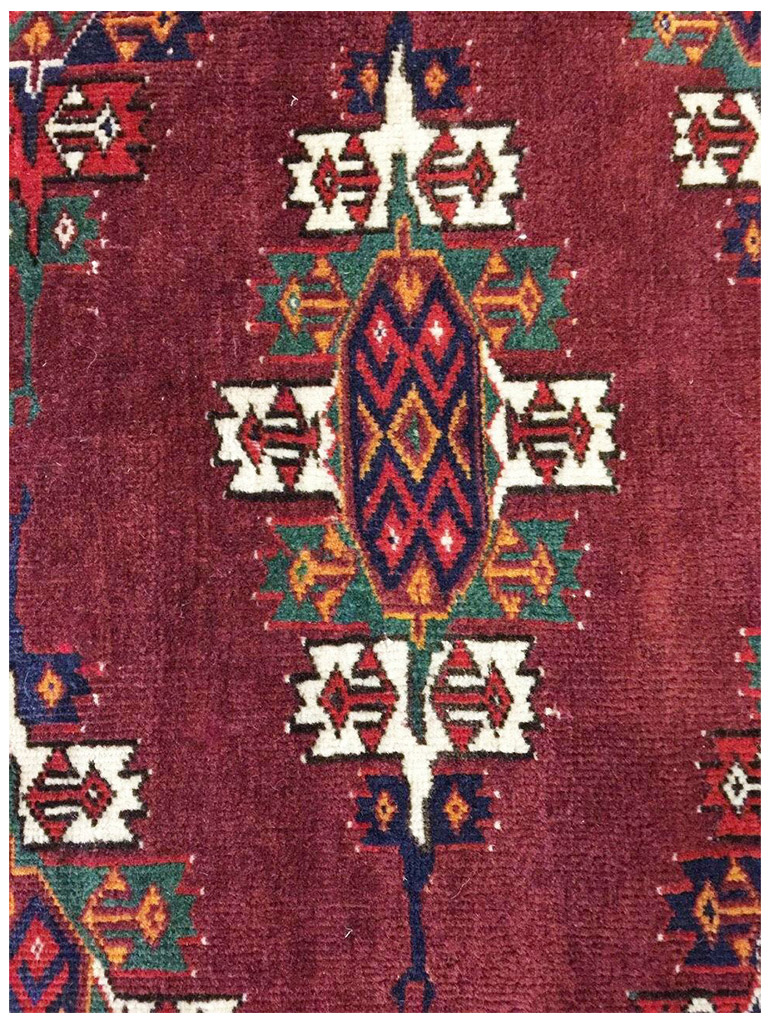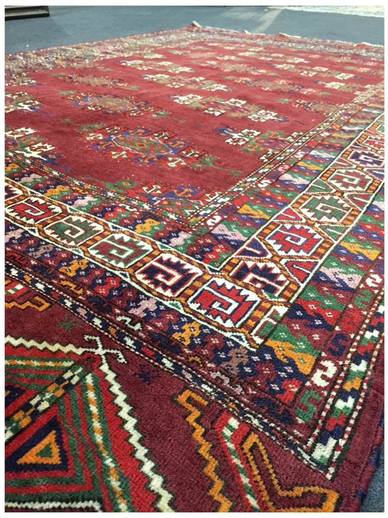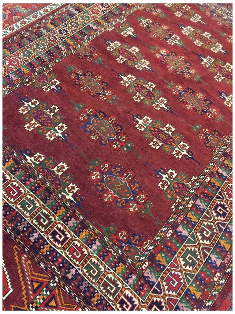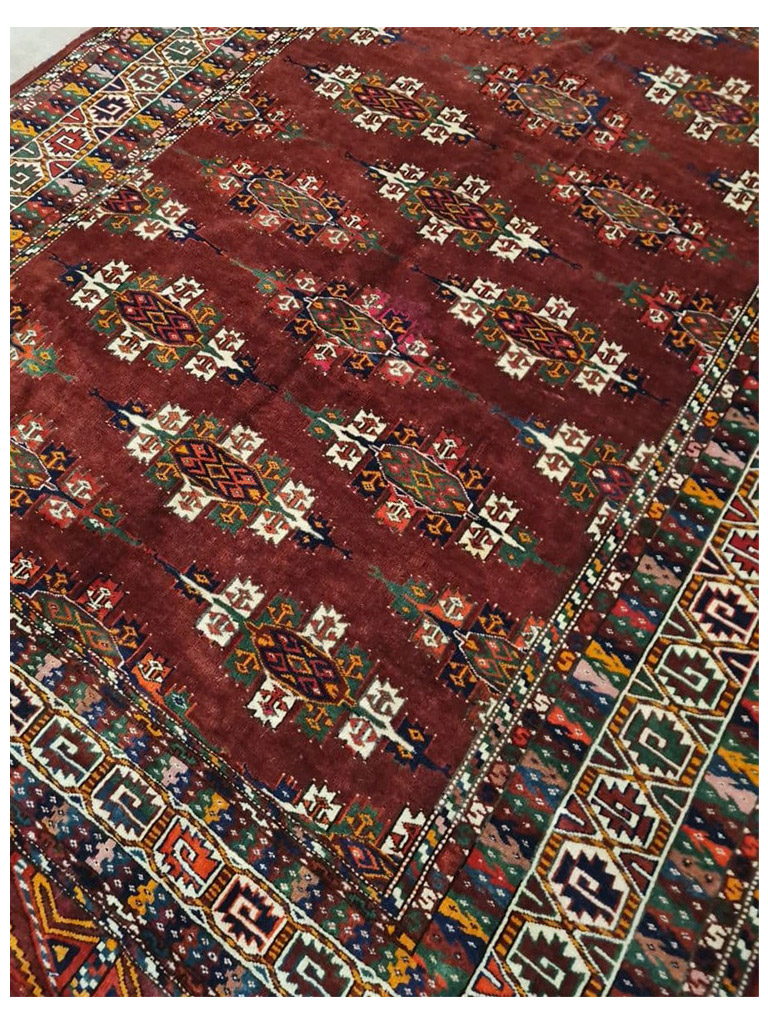 Tappeto bukara yamut Turkmeno (ex URSS), I tappeti Bukhara sono tra i più rinomati e conosciuti in tutto il mondo. Il loro classico disegno basato sulla ripetizione di motivi “gul” disposti regolarmente su tutto il campo e racchiusi da una cornice ricca di bordure minutamente decorate, è uno splendido esempio di equilibrio e armonia delle forme e dei decori. La produzione dei Bukhara avviene su un territorio piuttosto ampio, infatti le tribù turcomanne che li annodano vivono a cavallo tra il Turkestan (ex URSS), l’Afghanistan e l’Iran. I russi sono sicuramente i più apprezzati anche in virtù di un particolare processo di lavaggio a cui questi vengono sottoposti (Kiskan process), che li rende ancora più morbidi e che dona ai colori una patina particolare. bellissima tappeto bukara yamut russo antico 1930 con i colori belli e brillanti MIS:240×165 CM Origine:turkmeno (ex URSS), materiali:tutto lana eta:1920 In condizioni eccellenti. Con certificato e garanzia.